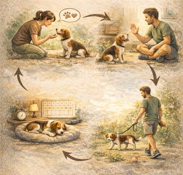 O tratamento começa antes do barulho, regulando o ambiente e o sistema nervoso com rotina previsível, atividades calmantes e respostas corretas do tutor.